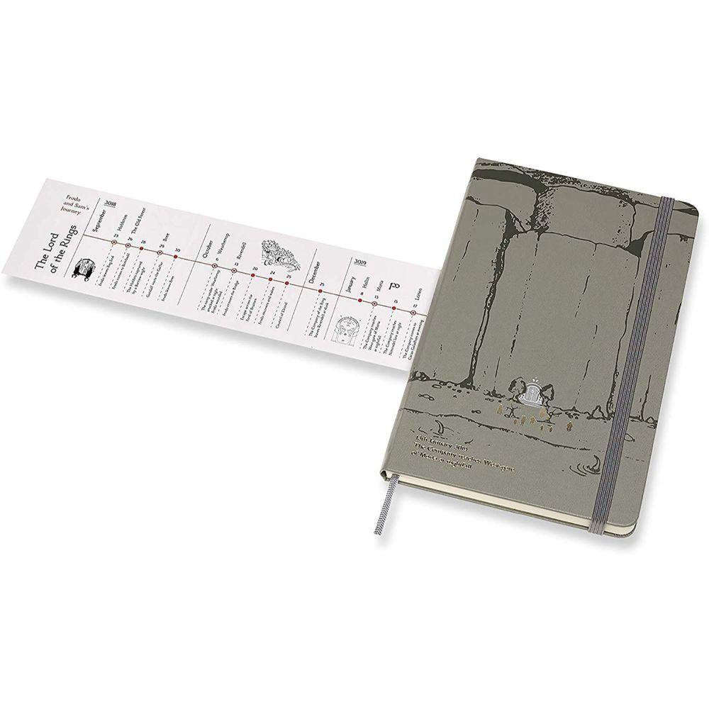 Brush up your Middle-earth language skills with the Cirth alphabet insert and the Elvish translation on the notebook paperband, and then follow the characters on their heroic journey with the B-side timeline.