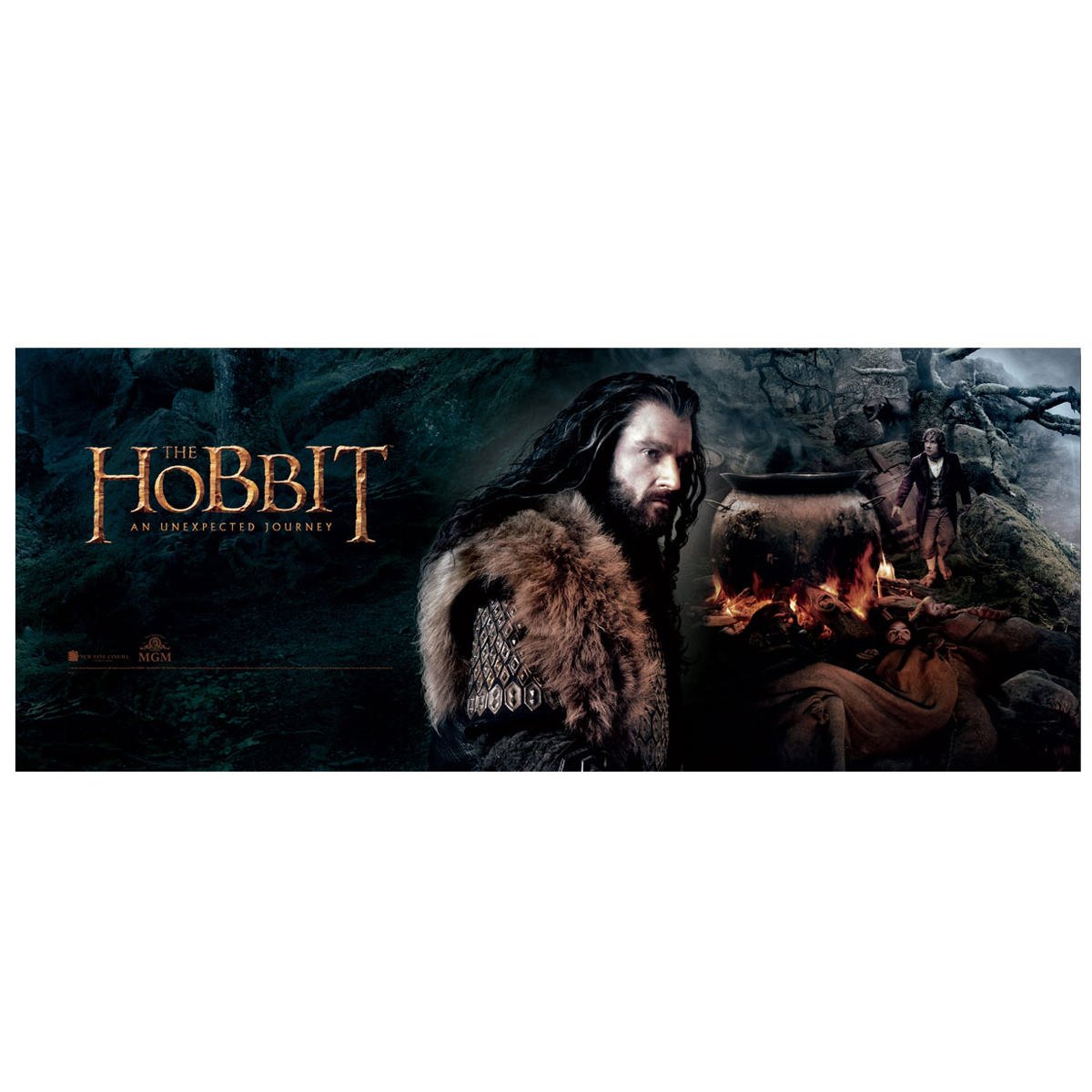 This striking panoramic poster from The Hobbit: An Unexpected Journey is a collage of Thorin Oakenshield in the foreground, Bilbo Baggins the background, and the dwarves -- tied up in sacks next to the trolls' cauldron -- in the middle. Printed on high quality heavyweight glossy photographic paper, this poster will look great in any room of your home and is suitable for framing. Available in three sizes up to 20 x 50 inches!