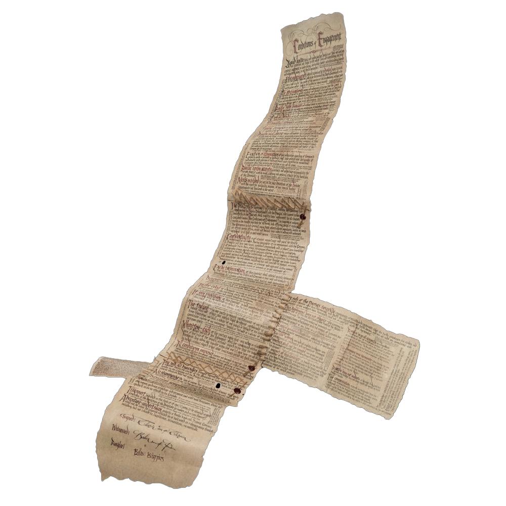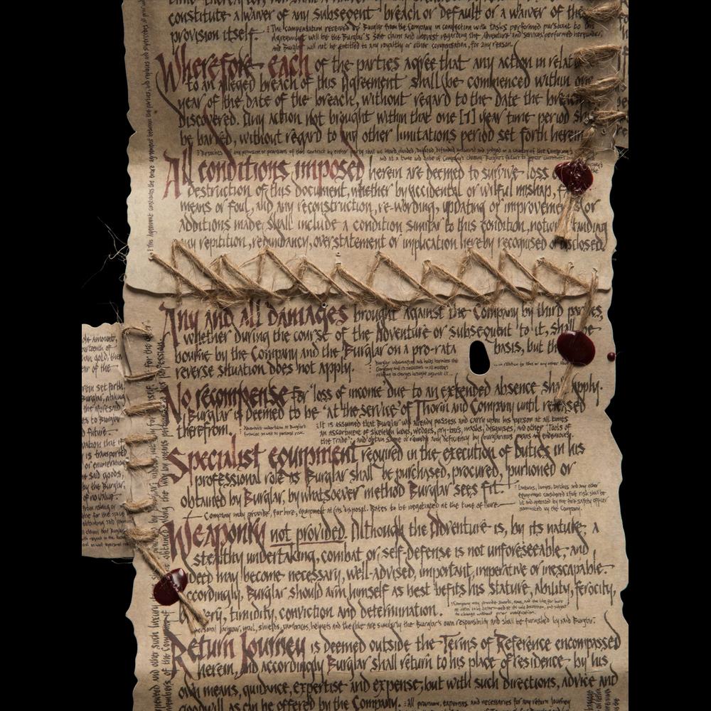 A hefty document by any standards, Weta Workshop shrunk the contract to 3:4 scale to create a more manageable, miniature prop replica. All text, including the fine print, is legible.