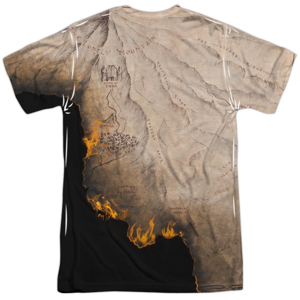 This sublimated t-shirt features a design of Smaug inspired by the film. This t-shirt is hand-printed using a dye sublimation printing process that creates slight imperfections over seams and/or folds and are unique to and a part of each t-shirt. 100% polyester.
