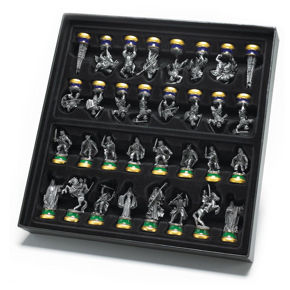 This gorgeous, high-end The Lord of the Rings chess set from the Noble Collection is a work of art detailing the story of Frodo and the friends and enemies he encounters on his journey to destroy the One Ring. A map of Middle-earth is mounted below the playing surface, and the base contains images of the most memorable characters and scenes from the film. The 32 playing pieces are detailed miniature sculptures of the characters from the film, made in fine pewter. Each piece measures between 2 - 3 inches in height and bears an incredible likeness to the actor as it was personally approved by each of them. Some of the pieces included are: Arwen, Aragorn, Gandalf™, Galadriel, Boromir, Pippin, Frodo, Sam, Merry, four different Orcs, Orthanc Tower, Cave Troll, Ringwraith, Saruman, Lurtz, and Uruk-Hai. The board measures 15 by 15 by 4.5 inches. The top of the board is plexiglass and the rest of the board is made from cold cast porcelain. Hero pieces have a green ring around the bottom and villain pieces have a purple ring around the bottom. A heavyweight item, this is a chess set that will be treasured for generations.